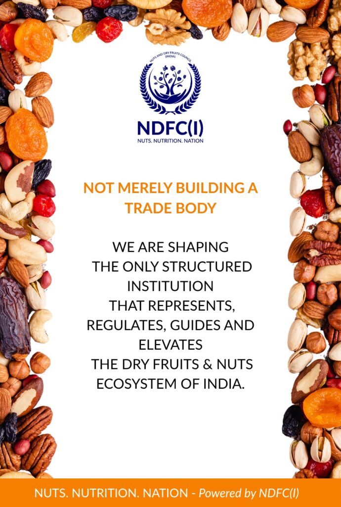NDFC(I) proudly stands as the unified voice for everyone in the Nuts, Dry Fruits, Raisins, Berries, and Dates Industry in India. Our mission is to be the driving force that uplifts and empowers every facet of this vibrant sector. From growers to processors to distributors, NDFC(I) is dedicated to fostering unity and collaboration.